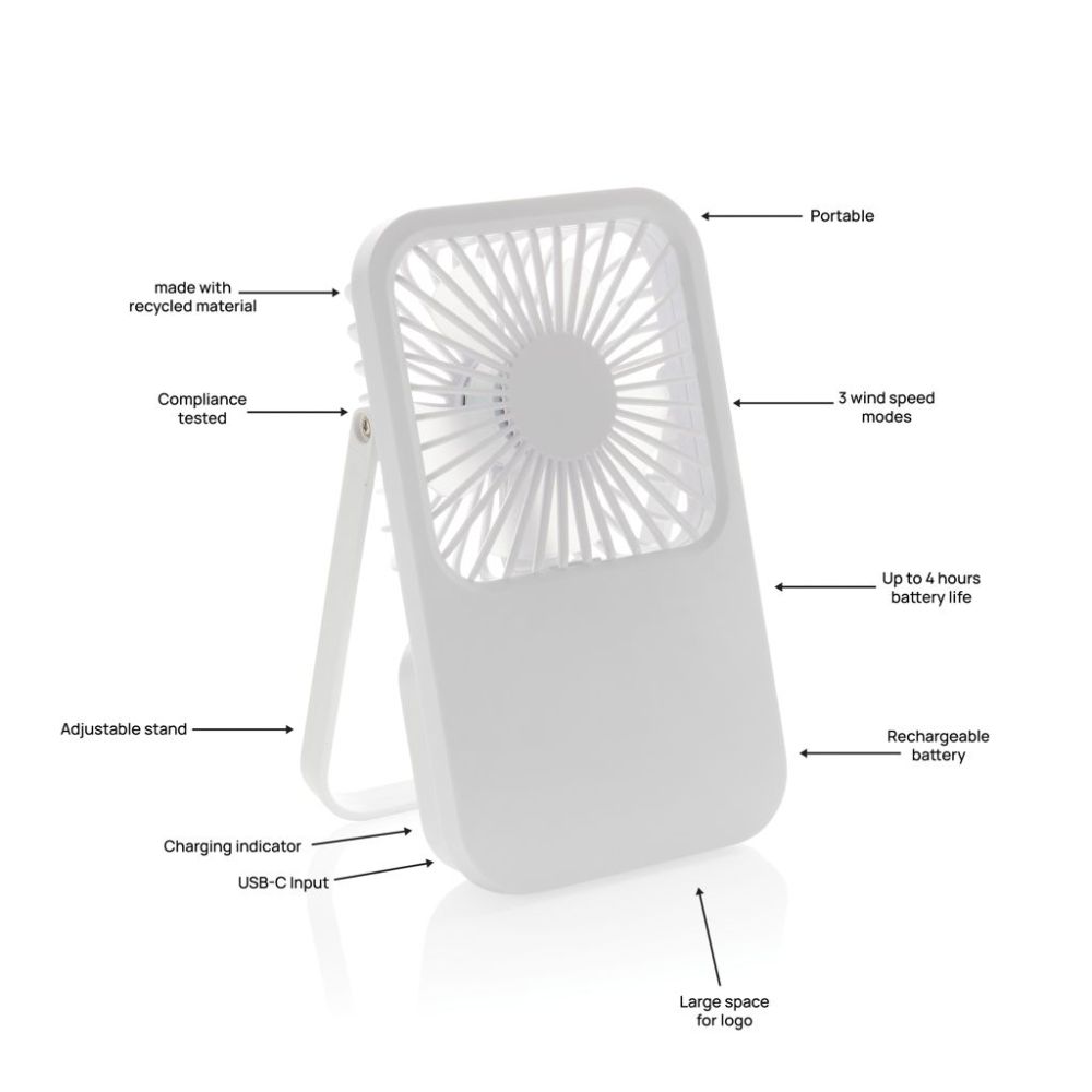Stolový ventilátor Aervina z certifikovaného recyklovaného plastu RCS je elegantný a praktický doplnok pre domov alebo kanceláriu. Moderný čierny dizajn spája štýl s funkčnosťou. Dobíjateľná Li-ion batéria 1200 mAh poskytuje až 3 hodiny prevádzky a nabíja sa za 4 hodiny cez priložený 120 cm USB-A ↔ USB-C kábel z TPE. Ponúka tri úrovne rýchlosti a nastaviteľný stojan pre maximálne pohodlie. Vyrobené z recyklovaného ABS (RCS). RCS (Recycled Claim Standard) je štandard na overenie recyklovaného obsahu produktu v rámci celého dodávateľského reťazca. Celkový podiel recyklátu: 58 %. Bez PVC, balené v FSC® kraftovej krabičke. Max. výkon: 5 W | Vstup: 5 V / 400 mA.