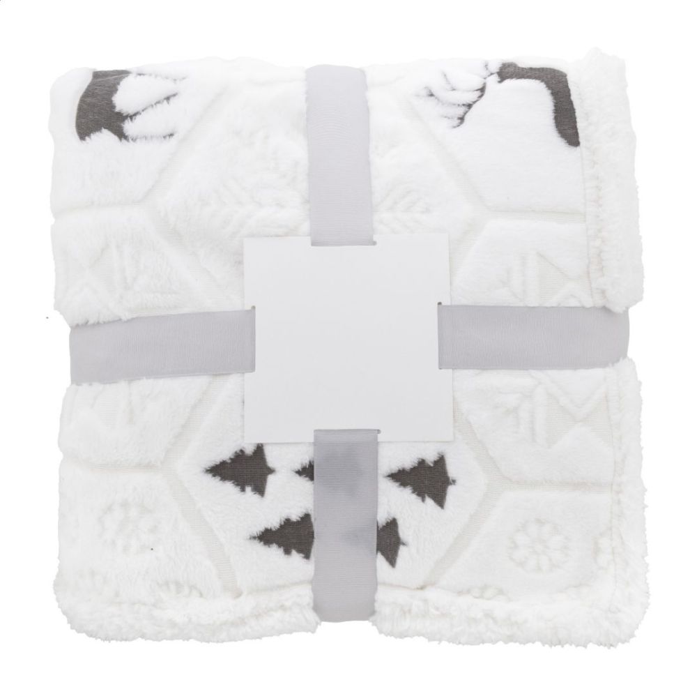 Luxusná dvojvrstvová vianočná deka z RPET s reliéfnym zimným vzorom. S flanelovým fleecovým materiálom RPET 270 g/m² a obojstrannou podšívkou z RPET sherpa fleecu 210 g/m². Zabalené do stuhy a tlačiteľného papierového kartónu.