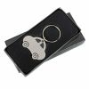 Přívěsek na klíče z kovu ve tvaru auta v černé dárkové krabičce.