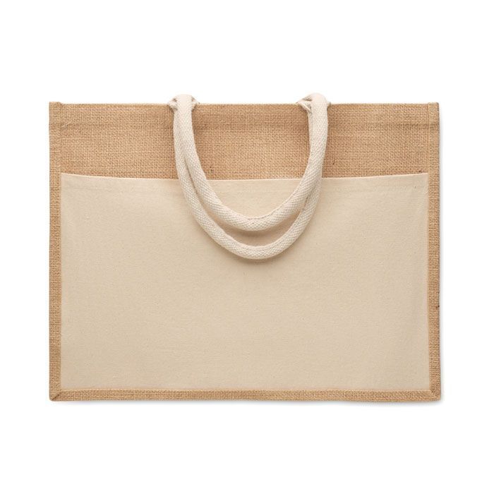 Nákupní taška z laminované juty a bavlněného 280 g plátna. Provazová ucha. Velkoá otevřená přední kapsa.