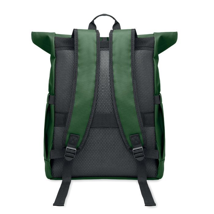 Rolovací batoh na 15palcový notebook z polyesteru RPET 600D potaženého PU s podšívkou z polyesteru RPET. Síťovaná polstrovaná záda s kapsou na zip a popruhem na kufr na kolečkách. Polstrovaný ramenní popruh se síťovanou vnitřní úpravou.