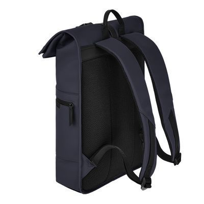 Designed with form as much as function in mind, this casual-inspired rolled-top backpack is rendered in a deep navy tone, elevated by elegant black matte details. A subtle utilitarian aesthetic is expressed through its rolled-top closing construction, perfectly finished with an integrated magnetic closure engraved with the RR signature. The silhouette is light and roamy, ideal for daily movement. Two flat zipped pockets to the front provide practical organization, while the interior features a dedicated laptop compartment for everyday essentials. A padded back panel and padded shoulder straps ensure lasting comfort in use. Inside, a spacious roamy interior reveals a refined monogram lining, completed with a zipped inner pocket for secure storage. It is the perfect accessory for someone with a minimalist yet casual and modern aesthetic.