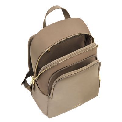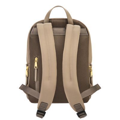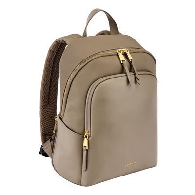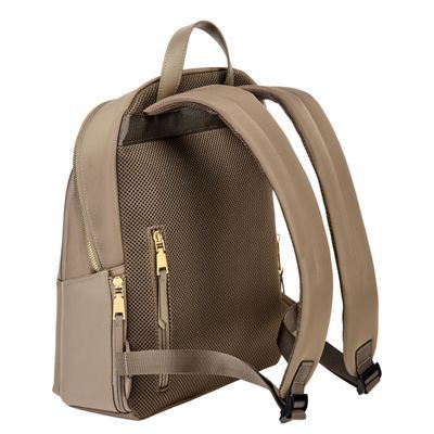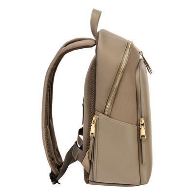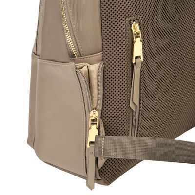 The Olympe Backpack is a minimalist piece elevated by a refined softness, crafted in contrasting nylon and high-quality vegan leather kept tone-on-tone for a clean, understated aesthetic. Its luxurious gold signature and accents stand out against the sleek silhouette, while smart functionality comes through a front zipped compartment, a spacious main section with multiple pockets—including a secure zipped one—and two highly practical side pockets. Designed for comfortable daily use, it features a padded back panel with a discreet zipped compartment for valuables, along with padded shoulder straps. Available in a beautiful palette of black, beige, and grey.