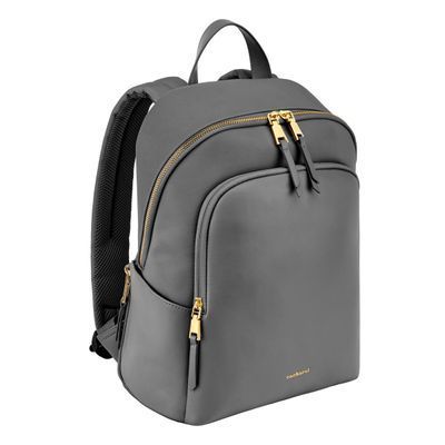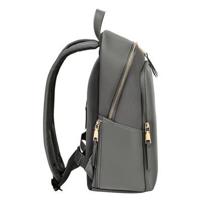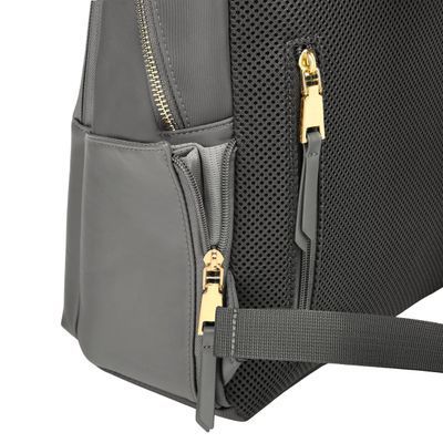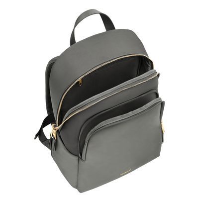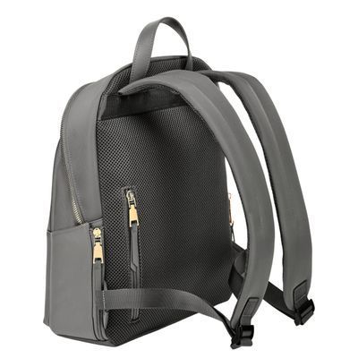 The Olympe Backpack is a minimalist piece elevated by a refined softness, crafted in contrasting nylon and high-quality vegan leather kept tone-on-tone for a clean, understated aesthetic. Its luxurious gold signature and accents stand out against the sleek silhouette, while smart functionality comes through a front zipped compartment, a spacious main section with multiple pockets—including a secure zipped one—and two highly practical side pockets. Designed for comfortable daily use, it features a padded back panel with a discreet zipped compartment for valuables, along with padded shoulder straps. Available in a beautiful palette of black, beige, and grey.