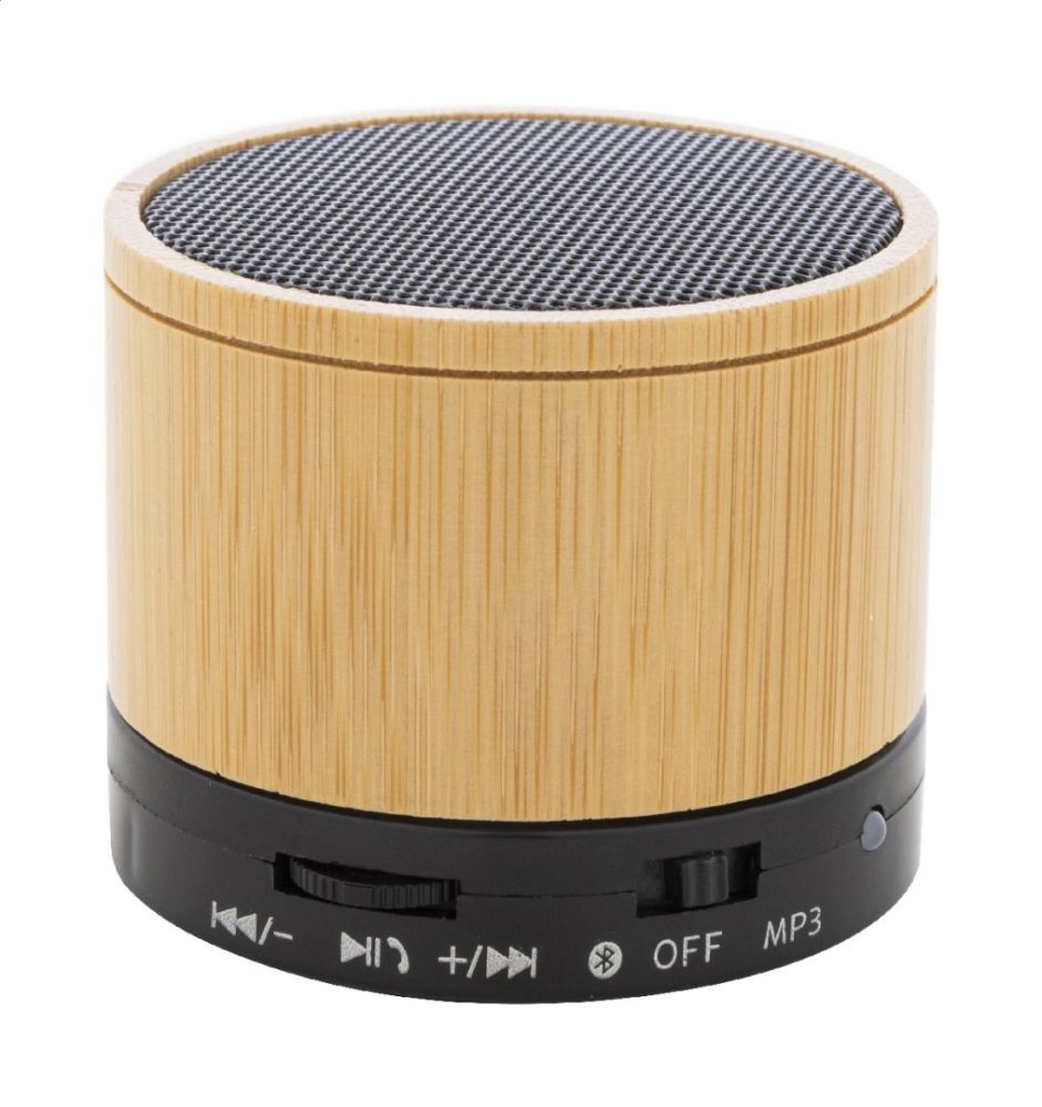 Bezdrôtový reproduktor v puzdre z recyklovaného ABS a bambusu s kovovou sieťovinou a dobíjacou batériou (300 mAh). S funkciou handsfree hovorov a prehrávanie MP3 z micro SD karty. Vrátane nabíjacieho kábla USB.