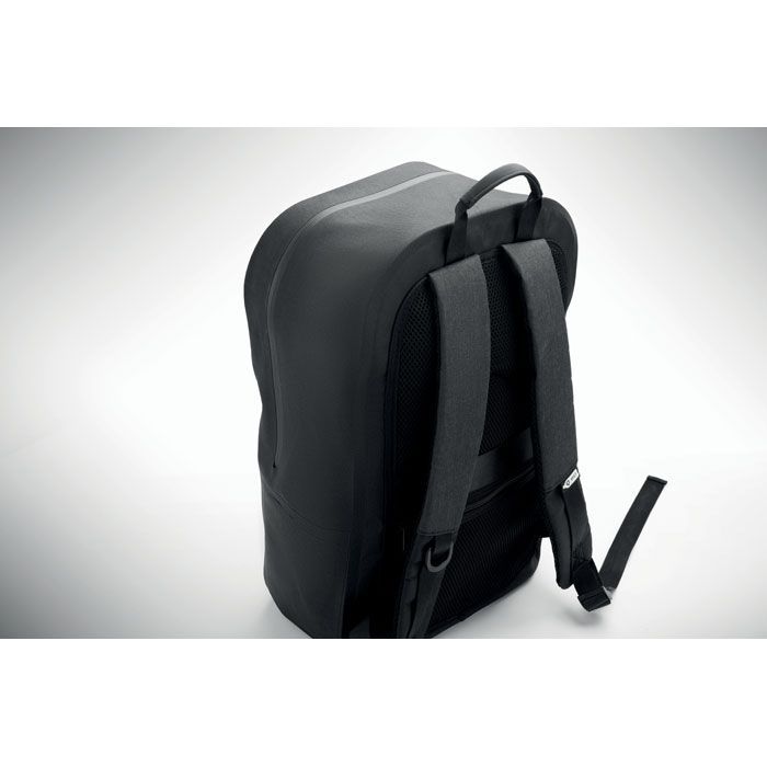 Batoh na 16''notebook z polyesteru 300D RPET s podšívkou z 210D polyesteru. Voděodolná tkanina. Skrytá kapsa na zip a poutko na kufřík na zadní straně. Polstrovaná vnitřní přihrádka na notebook, záda ze síťoviny a ramenní popruh.
