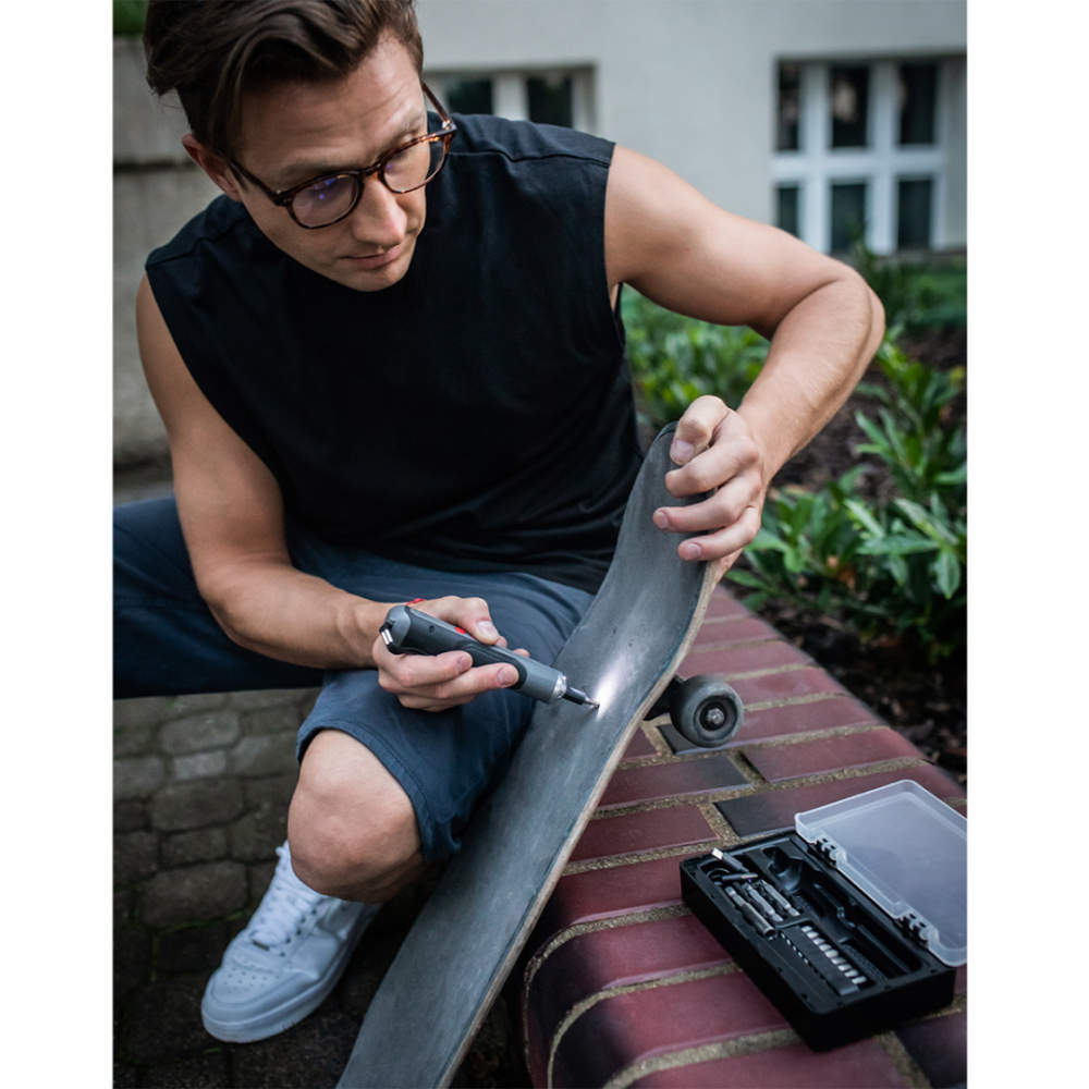 Sada s akumulátorovým šroubovákem v pevném kufříku z plastu. Obsah: šroubovák s ergonomickou rukojetí a dvěma směrovými tlačítky pro snadné šroubování a odšroubování, 10 bitů různých velikostí, 4 nástavce na bity, magnetický nástavec a USB kabel pro nabíjení. Dobíjecí baterie 1 300 mAh, krouticí moment 3 Nm, 250 ot./min.