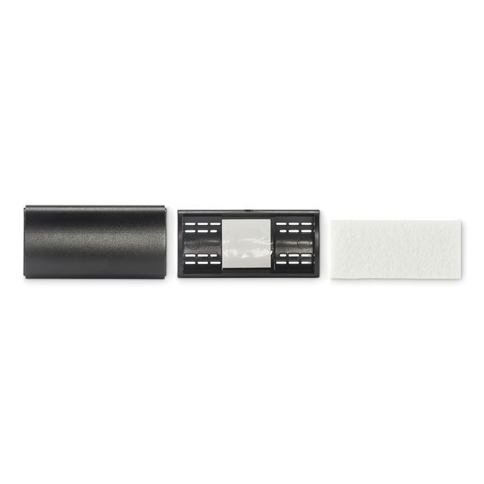 Osvěžovač vzduchu do auta s hliníkovým krytem a klipem ABS. Vnitřní plstěná vložka z RPET pro aroma kapalinu (není součástí dodávky).