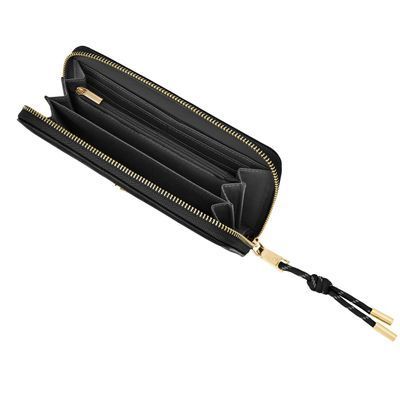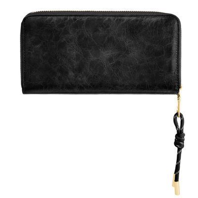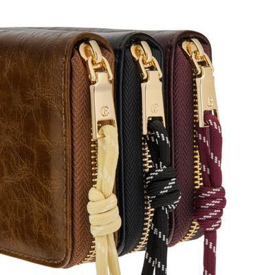 The Philomene zipped wallet combines elegance with a strong fashion-forward edge. Crafted from a glazed, crinkled leather-like texture, it is signed with the signature Cacharel C plate and highlighted by refined gold trims. Its distinctive zipper puller features a utility-inspired cord element that contrasts beautifully with the wallet’s chic and sophisticated finish. Inside its zipped interior, the wallet offers generous organization with a large zipped coin compartment, twelve card slots, and two note compartments, ensuring both style and practicality. Available in a chic palette of black, camel, and burgundy.