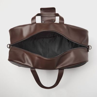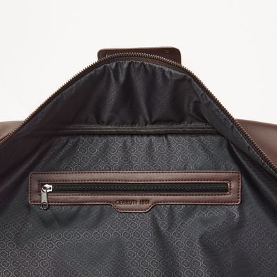 Minimal, elegant and understated the Bond travel collection is mixing contemporary nylon with luxurious vegan leather texture for a result that is easy to wear and match with any outfit. The bags are signed with a matt version of our CRR plate. All details are carefully though about : from zippers with engraved logo to an oversized yet subtle CERRUTI 1881 signature embossed on the side of the bag. This item is also very functional : roamy and easy to organise. It is available in 2 color versions : All black, or mixing brown and grey for a resolutely chic result.