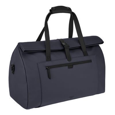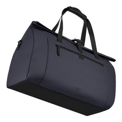 Designed with form as much as function in mind, this casual-inspired weekend bag is rendered in a deep navy tone, elevated by elegant black matte details. A subtle utilitarian aesthetic is expressed through its rolled-top closing construction, perfectly finished with an integrated magnetic closure engraved with the RR signature. The silhouette is light and roamy, created for effortless movement and everyday escape. A flat pocket to the front ensures easy access, while the detachable webbing strap allows adaptable carry. Inside, a spacious roamy interior reveals a refined monogram lining, finished with a zipped inner pocket for secure organization. It is the perfect accessory for someone with a minimalist yet casual and modern aesthetic.