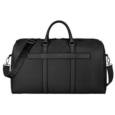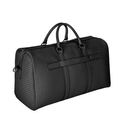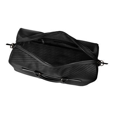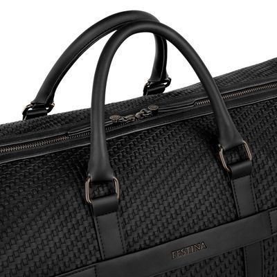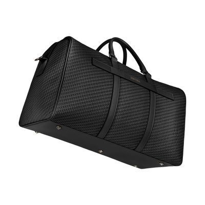 Defined by its woven-inspired texture, the Interlace weekend bag in black is crafted to resemble meticulous braiding and finished in a smooth matte that reinforces its luxurious, contemporary feel. This distinctive surface shapes its visual identity with depth and sophistication, elevated by signed details including blazon-engraved zipper pullers. Roamy and designed for effortless short escapes or work trips, the bag features a practical zipped pocket inside and a monogramed tone-on-tone lining that completes the design with refined precision. Paired with sleek gun accents, it stands as a resolutely chic expression of rich texture and modern elegance.