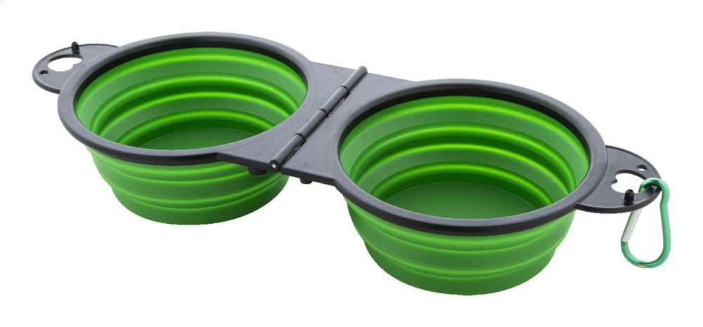 Skladacia miska pre domácich miláčikov z odolného TPE s dvoma priehradkami s objemom 450 ml a farebne zladenou hliníkovou karabínou.
