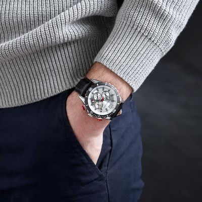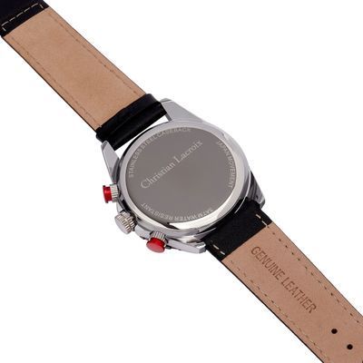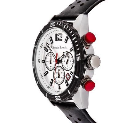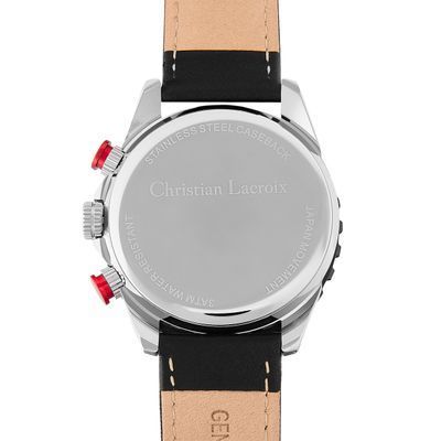 Introducing the "SOL" watch by Christian Lacroix, designed for a casual and active lifestyle. This timepiece features a black bracelet and a silver sunray dial, complemented by a black bezel and unexpected red buttons for a touch of dynamism. Available in both chrono and dater versions, the "SOL" watch offers a perfect blend of style and functionality. With the same brand's commitment to quality, this timepiece is crafted for those who appreciate both fashion and performance. Elevate your wrist presence with the dynamic charm of the "SOL" watch by Christian Lacroix.