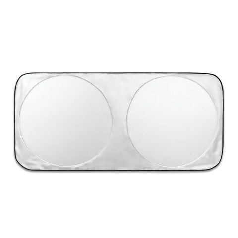 Slnečná clona do auta vyrobená z polyesteru 210D s dvoma kruhovými plochami s priemerom 65 cm. Tento inovatívny tvar je ideálny pre horúce dni. Dodávaná v taške z polyesteru 210D, je okrúhla pre ľahké skladovanie. 1500 x 700 mm