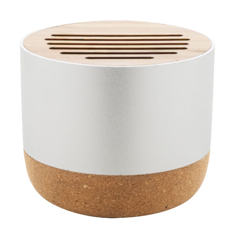 Bezdrôtový reproduktor v puzdre z recyklovaného hliníka s bambusovou sieťovinou a základňou z prírodného korku. S dobíjacou batériou (400 mAh). Vrátane nabíjacieho kábla USB.