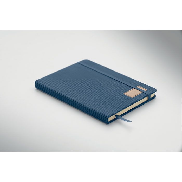 Zápisník A5 s tvrdými deskami potaženými polyesterovým RPET manšestrem. 192 linkovaných stránek z recyklovaného 70g papíru. Zavírání na gumičku, poutko na pero, záložka a etiketa z kraftového papíru.