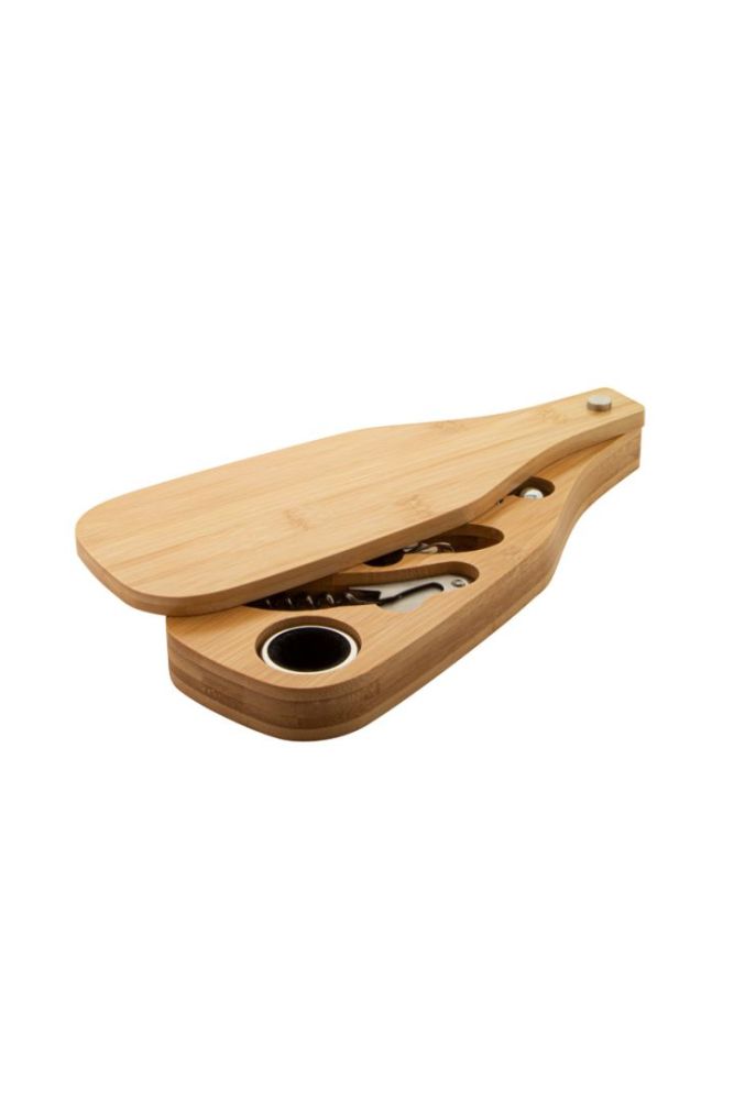 4 ks na víno z nerezovej ocele v bambusovej krabičke v tvare fľaše. Vrátane vývrtky, zátky, krúžku a lievika.