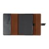 A5 koženkový poznámkový blok so 160 riadkovanými stranami, stuhovou záložkou a slučkou na pero alebo USB.