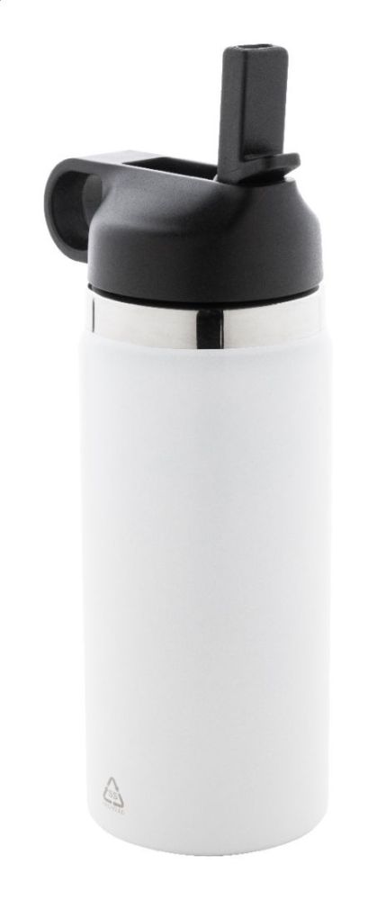 Dvojstenná vákuová fľaša z recyklovanej nerezovej ocele s odklápacím viečkom z PP, rukoväťou a integrovanou slamkou. 500 ml.
