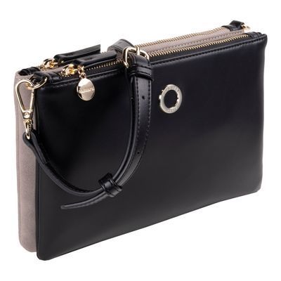 The Alix collection by Cacharel presents a lady bag that embodies style and elegance. The bag features two parts attached together, with natural light pink suede on one side and black on the other. Each part has a zipper closing and a long shoulder strap for convenience. The metallic ring in the center of the black compartment, engraved with the Cacharel logo, adds a touch of luxury to the design. This bag is the perfect accessory to elevate any outfit and showcase your impeccable taste. Invest in this stunning piece to add a timeless and versatile addition to your collection.