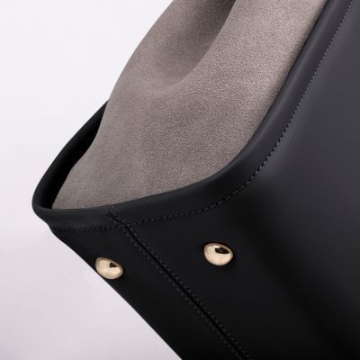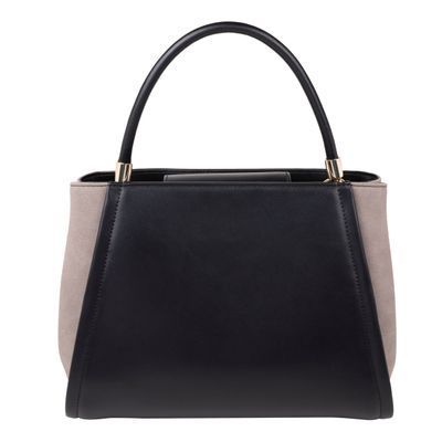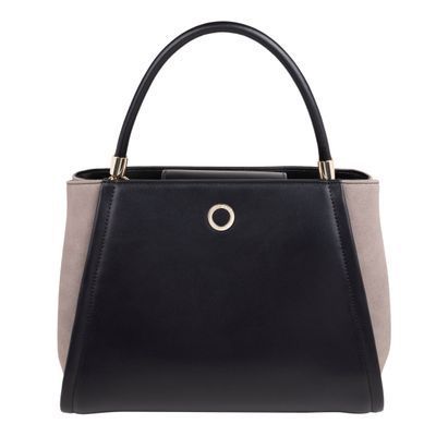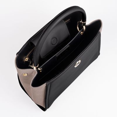 The black and grey purse from the Alix collection has two handles on either side and one long adjustable strap that can be used to carry it over the shoulder or across the body. The contrast between materials gives it a classic and elegant look.