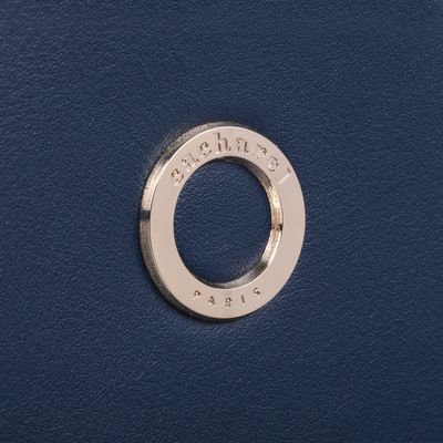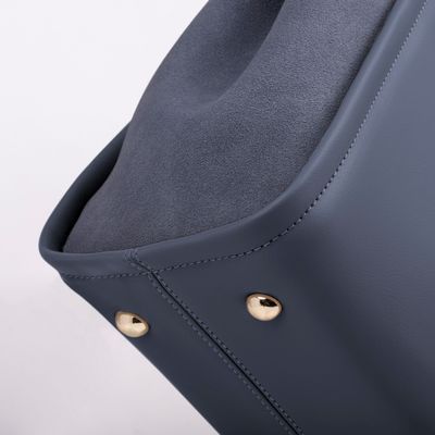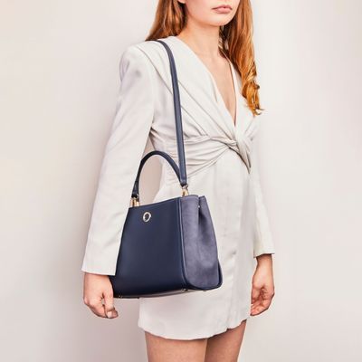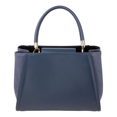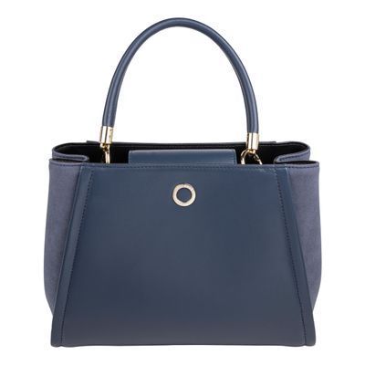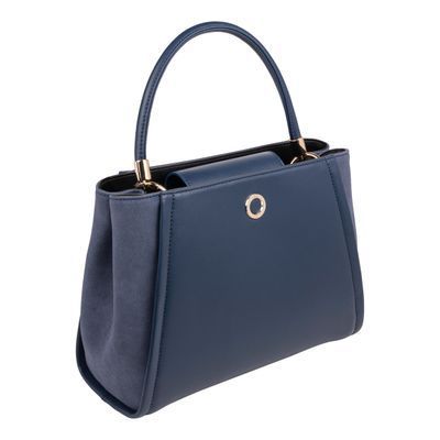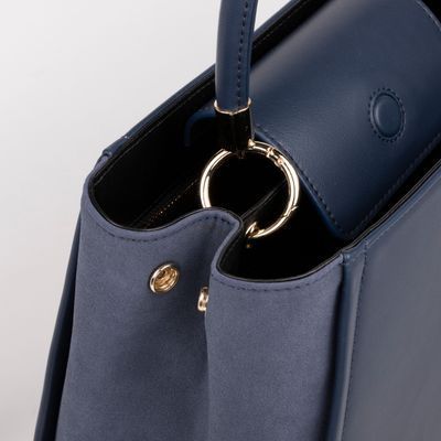 The blue purse from the Alix collection has two handles on either side and one long adjustable strap that can be used to carry it over the shoulder or across the body. The contrast between materials gives it a classic and elegant look.