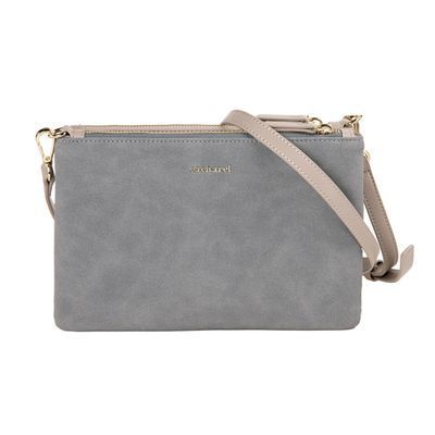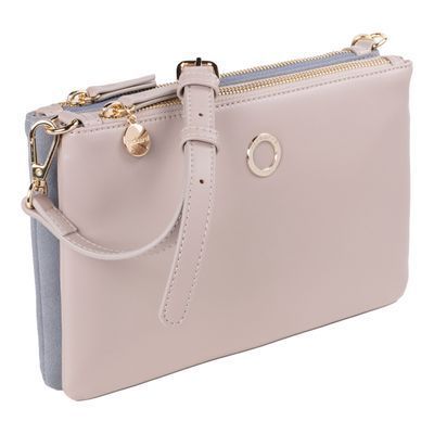 The Alix collection by Cacharel presents a lady bag that showcases elegance and sophistication. The bag features two parts attached together, with one in grey suede and the other in light pink. Each part has a zipper closing and a long shoulder strap for convenience. The metallic ring in the center of the light pink compartment, engraved with the Cacharel logo, adds a touch of luxury to the design. This bag is the perfect accessory to elevate any outfit and showcase your impeccable taste. Invest in this stunning piece to add a timeless and versatile addition to your collection.