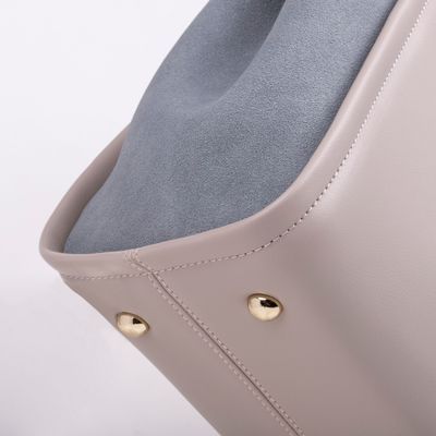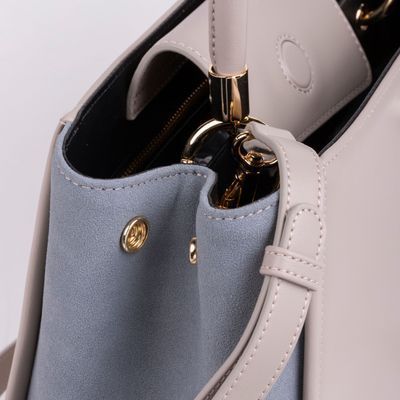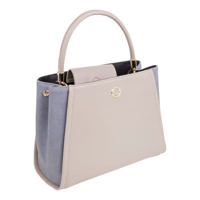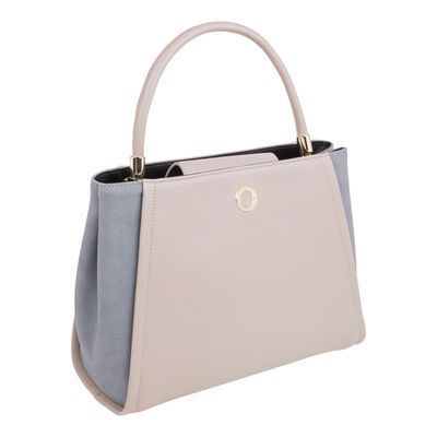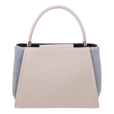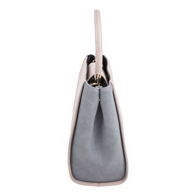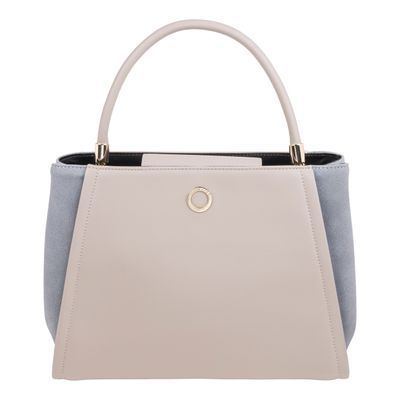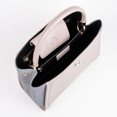 The light pink and grey purse from the Alix collection has two handles on either side and one long adjustable strap that can be used to carry it over the shoulder or across the body. The contrast between materials gives it a classic and elegant look.