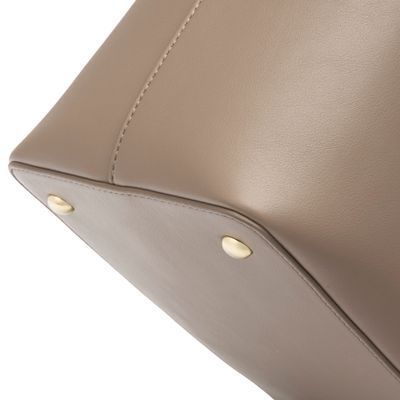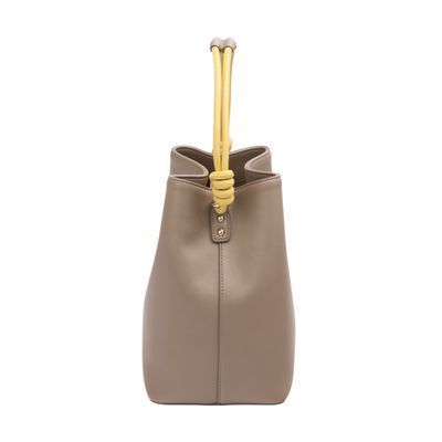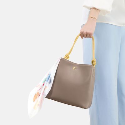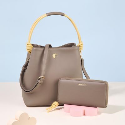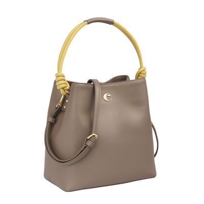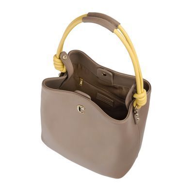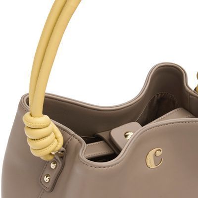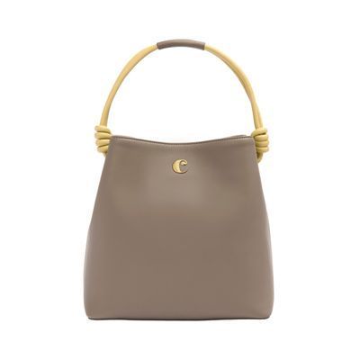 The Apolline bucket bag in taupe is made from soft, matte, high-quality vegan leather (PU) and features the iconic "C" logo on the front, with light gold-plated trims throughout, including the signature logo. The vibrant yellow knot-shaped handle adds a cheerful pop of color, while the TPU Cacharel gold signature on the back provides a subtle yet luxurious touch. The taupe version combines both elegance and practicality, making it a versatile and stylish accessory for any occasion. The line is soft, colorful, and playful, adding a lively energy to any outfit.