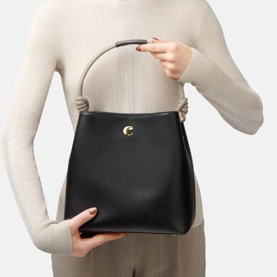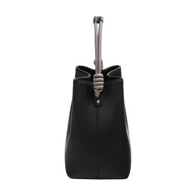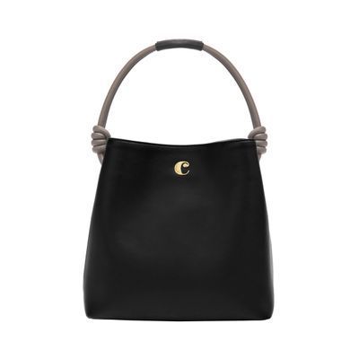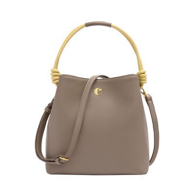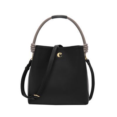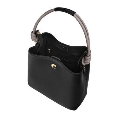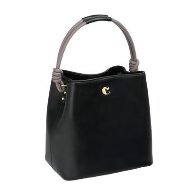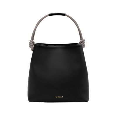 The Apolline bucket bag in black from Cacharel is crafted from soft, matte, high-quality vegan leather (PU) and features a bold design with the iconic "C" logo on the front. The bag is accented with a taupe knot-shaped handle, adding a distinctive touch to the sleek black base. All trims, including the signature "C" logo on the front, are light gold-plated for a touch of elegance. Additionally, a TPU Cacharel gold signature is featured on the back. The Apolline black bag offers a functional yet stylish solution for everyday use, with a spacious interior and versatile design. The line is soft, colorful, and playful, effortlessly blending elegance with modern charm.