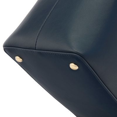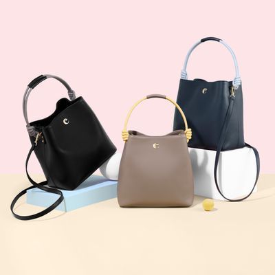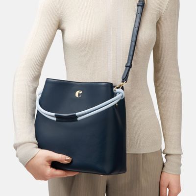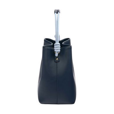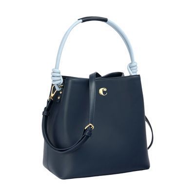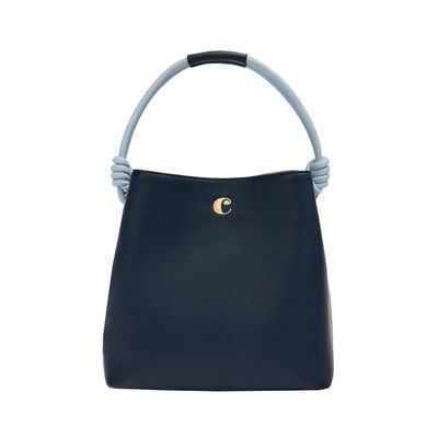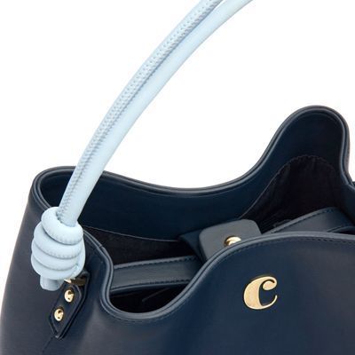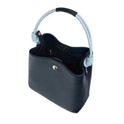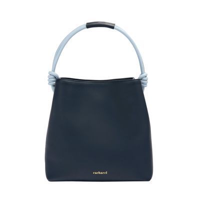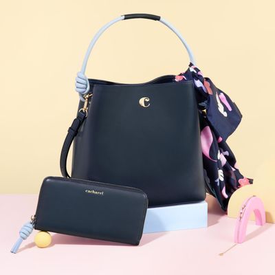 The Apolline bucket bag in navy is crafted from soft, matte, high-quality vegan leather (PU), with the iconic "C" logo on the front and light gold-plated trims. The bag’s light blue knot-shaped handle adds a modern twist to its classic design, while the TPU Cacharel gold signature on the back enhances its luxurious appeal. With a spacious interior and versatile design, the navy Apolline bag is both practical and stylish, perfect for complementing a variety of outfits. The line is soft, colorful, and playful, offering a fun and elegant way to elevate any look.