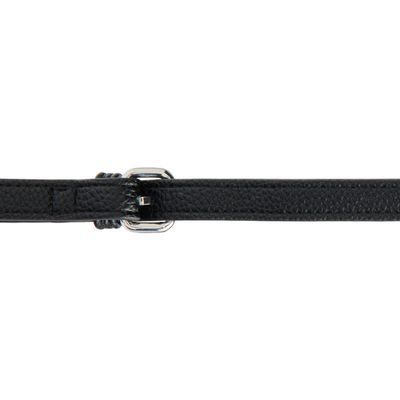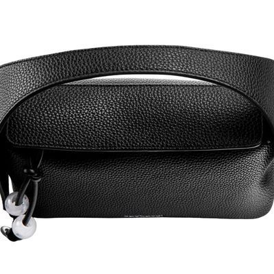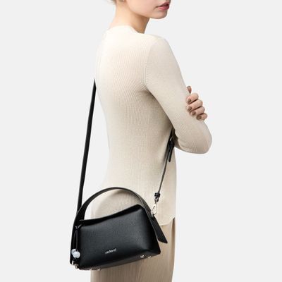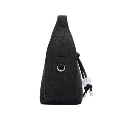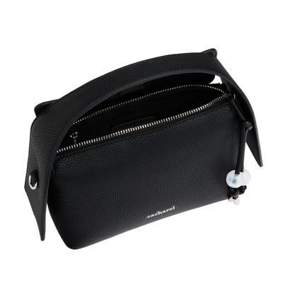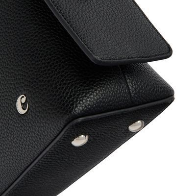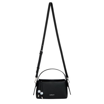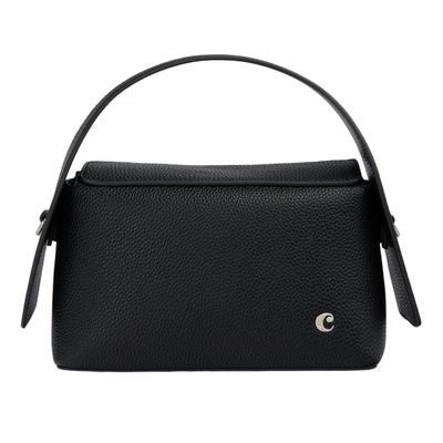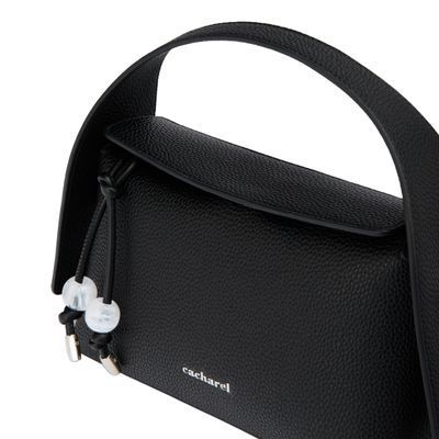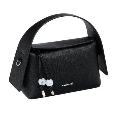 The “Clementine” bag in black matt grained vegan leather (PU) features a modern, contemporary design with a sleek, grained matte leather finish. The crisp chrome metal accents are bringing an additional touch of modernity. The deep minimal black color enhances the integrated, modern silhouette, while the unexpected handle design offers a distinctive touch. Signed with the iconic “Cacharel” logo on the front and a “C” plate on the back, the bag combines functionality with resolute style. The modern, sharp design combined with understated black textures make it a standout accessory.