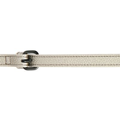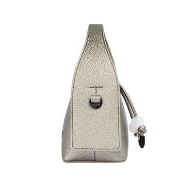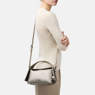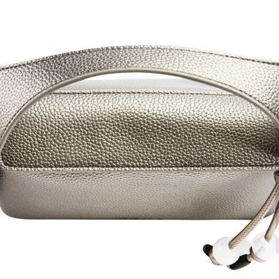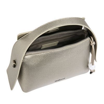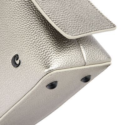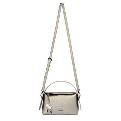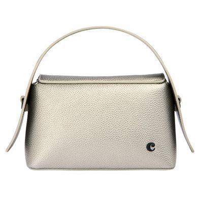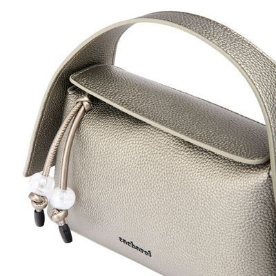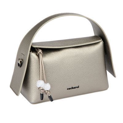 The “Clementine” bag in metalized bronze vegan leather (PU) features a modern, contemporary design with a sleek, grained matte leather finish. The Black matt metal accents are bringing an additional touch of modernity. The striking metalized material enhances the integrated, modern silhouette, while the unexpected handle design offers a distinctive touch. Signed with the iconic “Cacharel” logo on the front and a “C” plate on the back, the bag combines functionality with resolute style. The modern, sharp design and bold color make it a standout accessory.