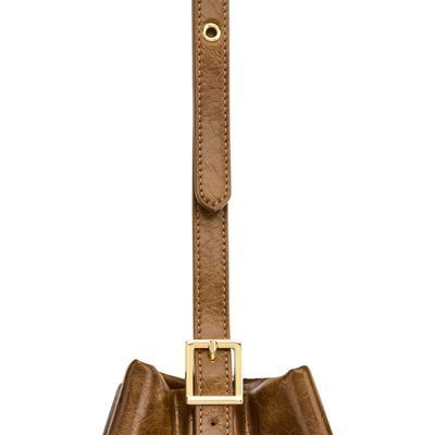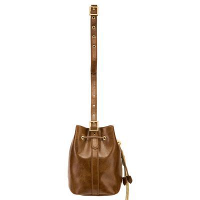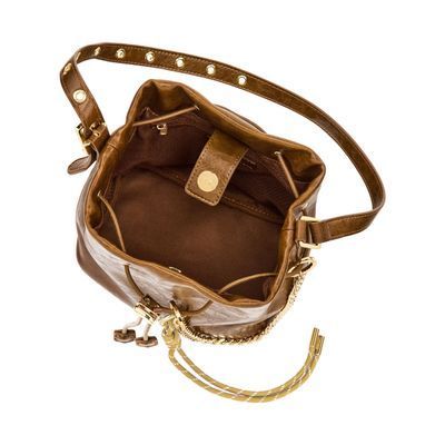 The Philomene bucket bag blends timeless elegance with a bold, fashion-forward attitude. Crafted from a glazed, crinkled leather-like texture, it is signed with the signature Cacharel C plate, enhanced by refined gold trims, and finished with a discreet embossed Cacharel logo. The material is soft, supple, and remarkably luxurious to the touch. Its adjustable strap allows for both hand and shoulder carrying, while an additional strap transforms it into a crossbody bag. A PU cord closure reinforces its pouch-like shape, and a removable decorative cord-and-chain charm adds a distinctive, stylish accent. Compact yet spacious, its interior offers ample room for essentials and includes a zipped pocket for added convenience. Available in black, burgundy, and camel.