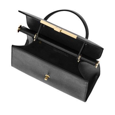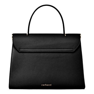 The Seraphine large bag exudes timeless sophistication with its structured and luxurious silhouette. Crafted from saffiano-textured vegan leather, it is signed with an exclusive gold turn-lock closure engraved with the Cacharel logo, embodying refined minimalism. Its elegant top handle enhances its polished character, while all gold trims add a feminine and elevated accent. A discreet gold TPU logo on the back completes the signature details. Designed to balance style and functionality, the spacious interior includes a zipped compartment for everyday organization. Available in taupe, light grey, and black.