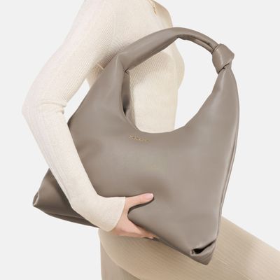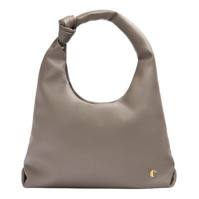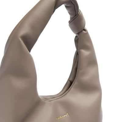 The "Violette" bag in taupe is a versatile and sophisticated accessory that combines modern comfort with chic style. Its matte vegan leather (PU) texture and soft-touch finish enhance the relaxed yet polished aesthetic of the wide, puffer silhouette, which offers generous space for essentials. The knotted handle is seamlessly integrated into the design, adding both a distinctive visual element and comfort for effortless carrying. The neutral taupe hue makes it an ideal choice for day-to-evening wear, effortlessly pairing with a variety of outfits. Finished with a luxurious golden "C" plate at the back, the bag exudes understated elegance, making it a statement of refined practicality and style.