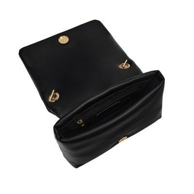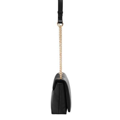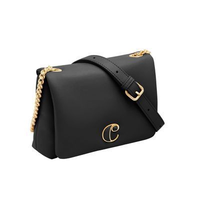 The "Vivienne" small bag in black is a timeless statement of chic sophistication. Made from soft matte vegan leather (PU) with a padded effect, its sleek design is elevated by gleaming gold trims. The gold "C" logo plate with a black ABS finish adds a striking and seamless touch of refinement. This crossbody bag is equipped with a PU and metal chain strap that is adaptable in length for added convenience. Compact yet practical, this bag seamlessly transitions from day to evening, offering versatility and style.