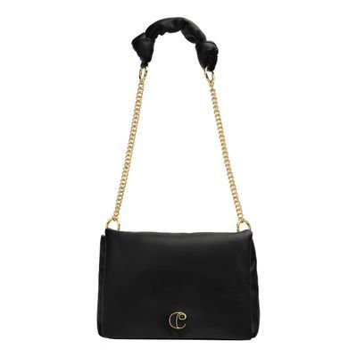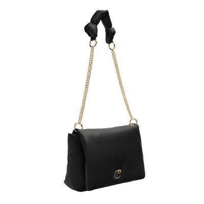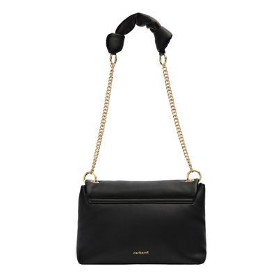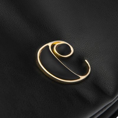 The "Vivienne" bag in black is a perfect blend of softness and allure, crafted from high-quality, soft matte vegan leather (PU) with a padded effect that enhances its refined silhouette. The gold accents bring warmth and luxury to the design, while the gold "C" logo plate with a black ABS finish seamlessly matches the bag's body for a polished and cohesive look. This version features a signature strap with elegant bow detailing and chain, offering a playful yet sophisticated element. The understated Cacharel logo signature completes its timeless appeal, while the spacious interior makes it ideal for daily use, combining practicality with a chic aesthetic.