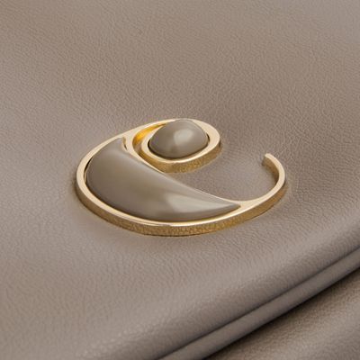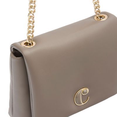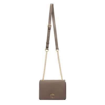 The "Vivienne" small bag in taupe embodies sophisticated neutrality with a soft matte vegan leather (PU) construction and a padded effect that enhances its modern silhouette. The taupe hue is beautifully accented by gold trims, while the gold "C" logo plate with a taupe ABS finish creates a harmonious and elegant detail. This crossbody bag includes a strap made of PU and metal chain, adjustable in length to suit various preferences. Its thoughtfully designed size provides functionality without compromising style, making it a versatile addition to any wardrobe.
