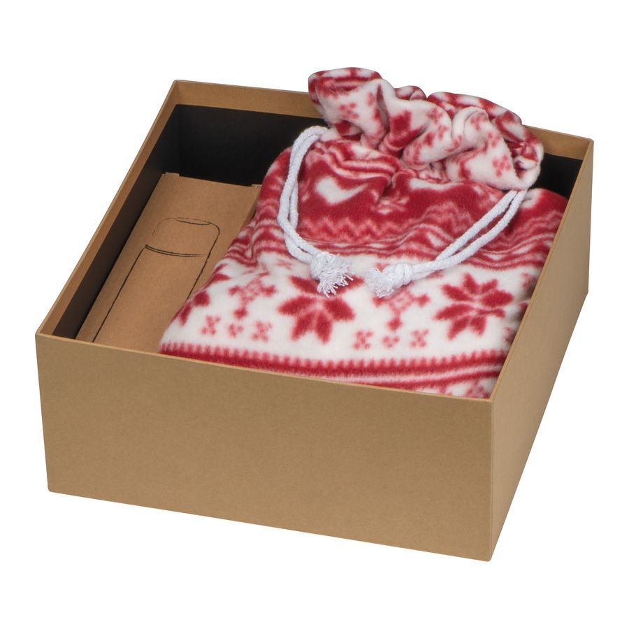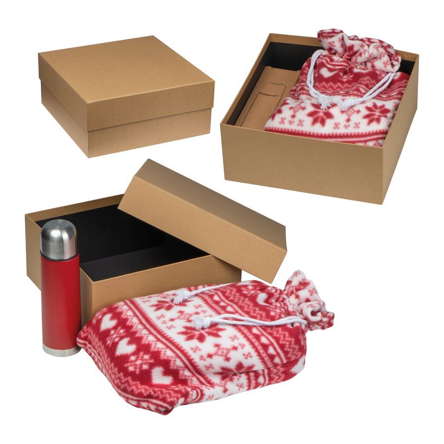 Darčeková súprava pozostávajúca zo zimnej flisovej deky (130 x 170 cm) a kovovej vákuovej termosky (500 ml).