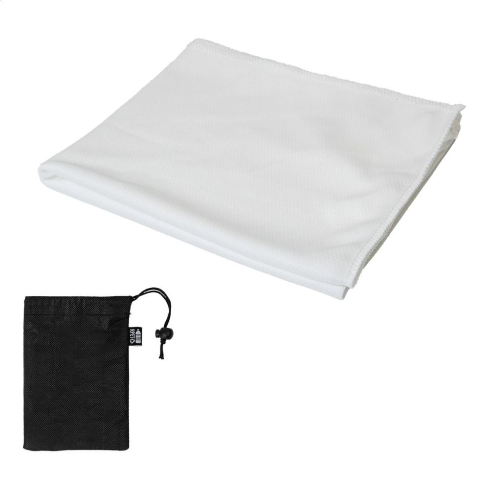 Športový uterák z mikrovlákna RPET v prepravnom puzdre z netkanej tkaniny RPET s charakteristickou etiketou RPET. Polyester RPET, 140 g/m².