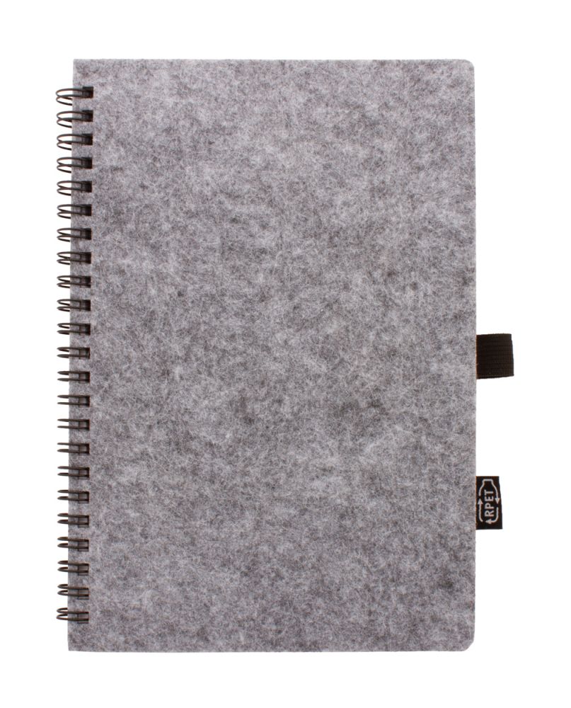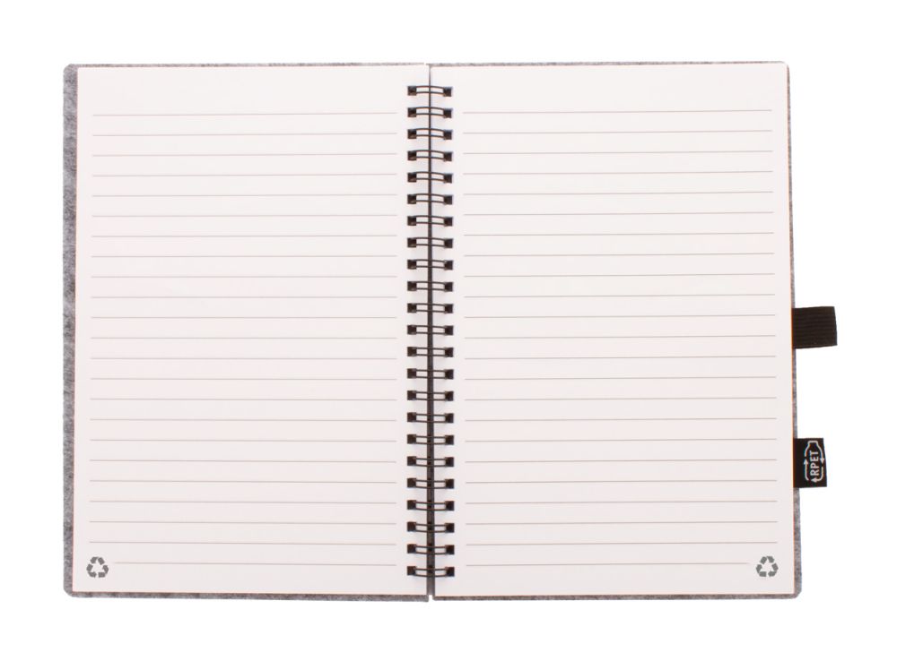 Špirálový blok A5 potiahnutý RPET plsťou s výrazným štítkom RPET a 80 linajkovými listami z recyklovaného papiera.