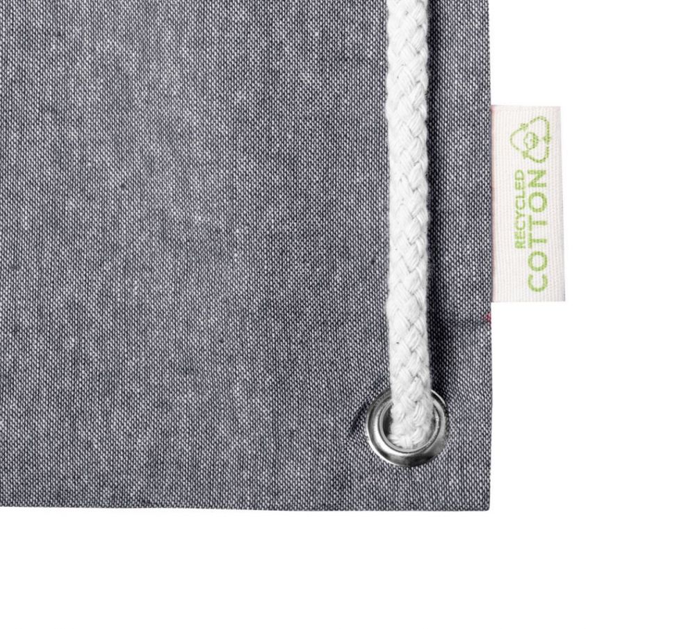 Vak z recyklovanej bavlny na sťahovanie silnými pletenými šnúrami, s dlhými uškami. Dá sa tiež použiť ako nákupná taška. 100% recyklovaná bavlna, 140 g/m².
