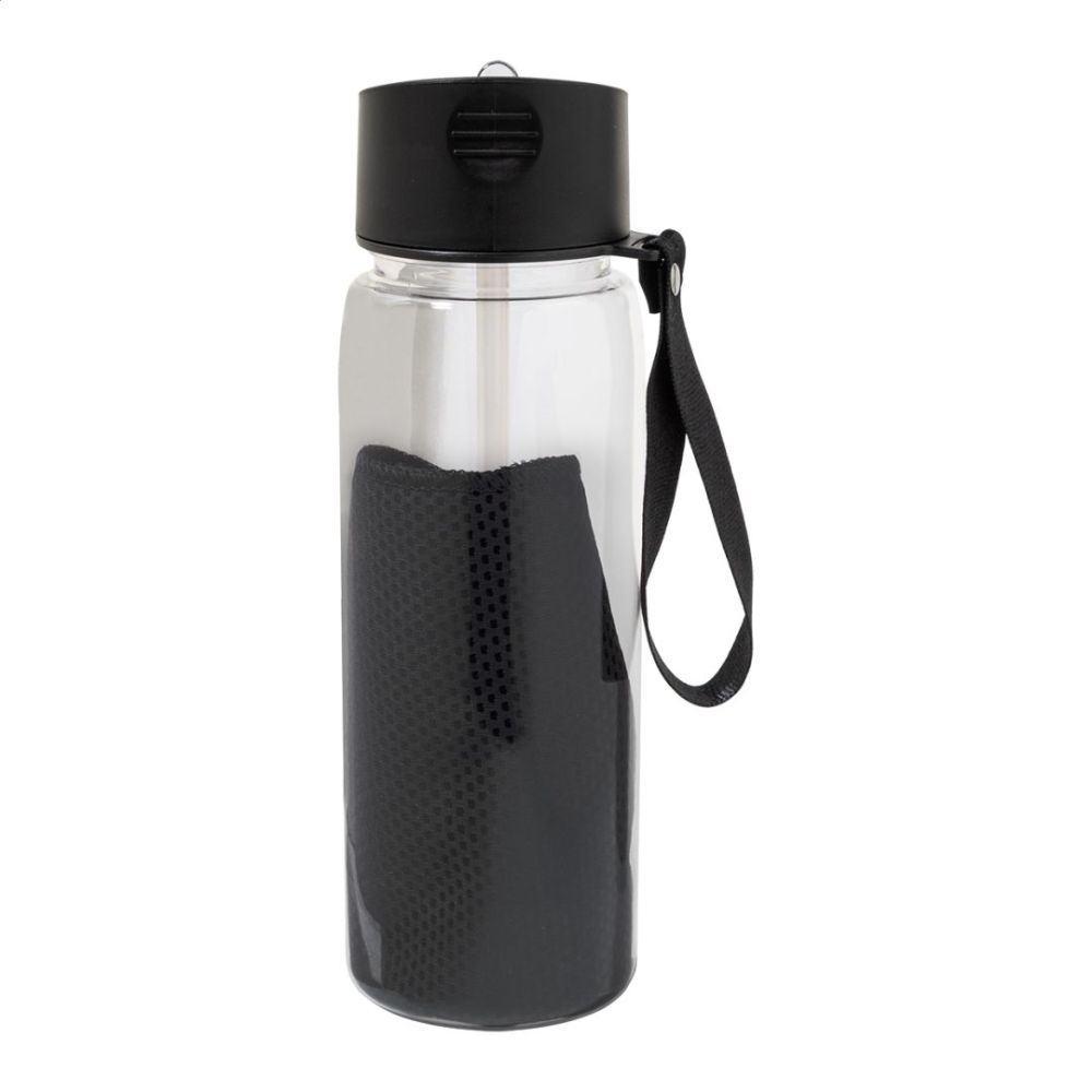 Chladiaci športový uterák z RPET polyesteru v RPET športovej fľaši s PP viečkom typu flip-top, integrovanou slamkou a prenosným popruhom. Objem 800 ml. Neobsahuje BPA. Nie je vhodná pre sýtené nápoje. Veľkosť uteráka: 30 × 80 cm.