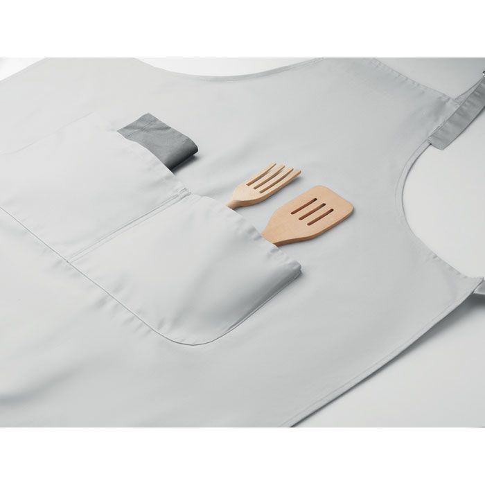 Dlouhá nastavitelná kuchyňská zástěra z polybavlny o gramáži 240 gr/m² (35 % bavlna, 65 % polyester) se dvěma předními kapsami a nastavitelným popruhem s kovovou sponou.