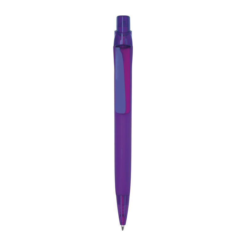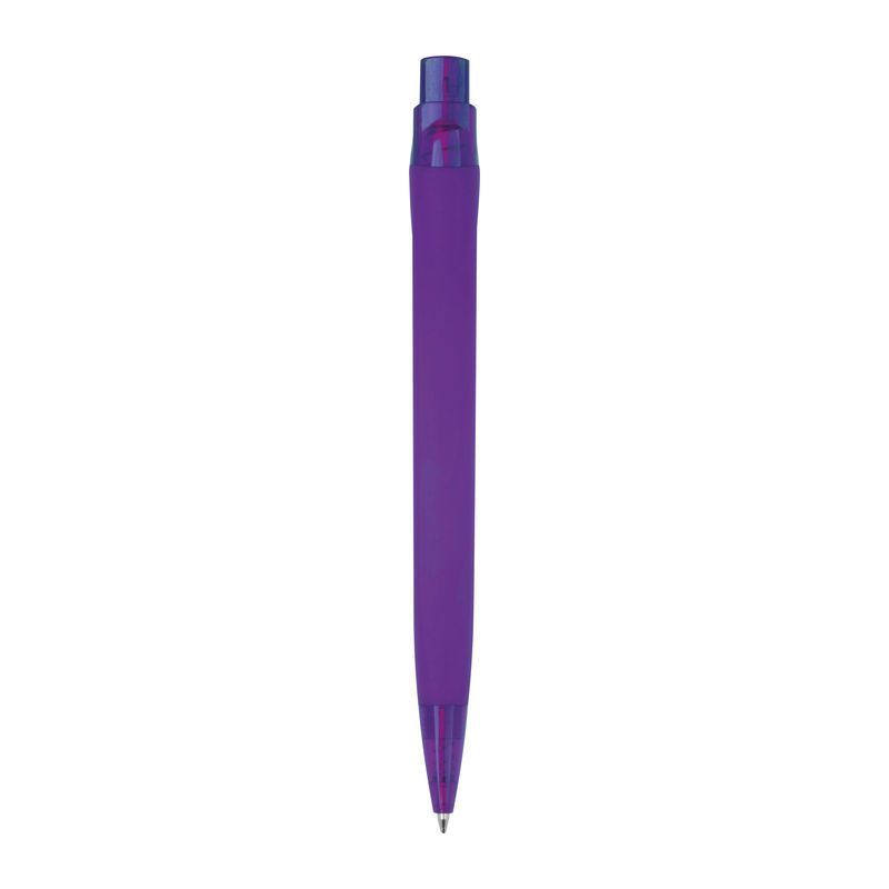 Pogumované plastové guľôčkové pero s veľkokapacitnou modrou náplňou (dĺžka písania cca 800 m).