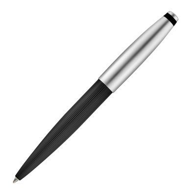 The Benson ballpoint pen features a refined two-tone design, pairing a matte chrome-plated cap luxuriously engraved with the new Cerruti logo with black matte trims echoing the pinstripe on the lower barrel. Finished with the new RR logo at the top, it delivers a smooth, reliable writing experience wrapped in understated elegance.