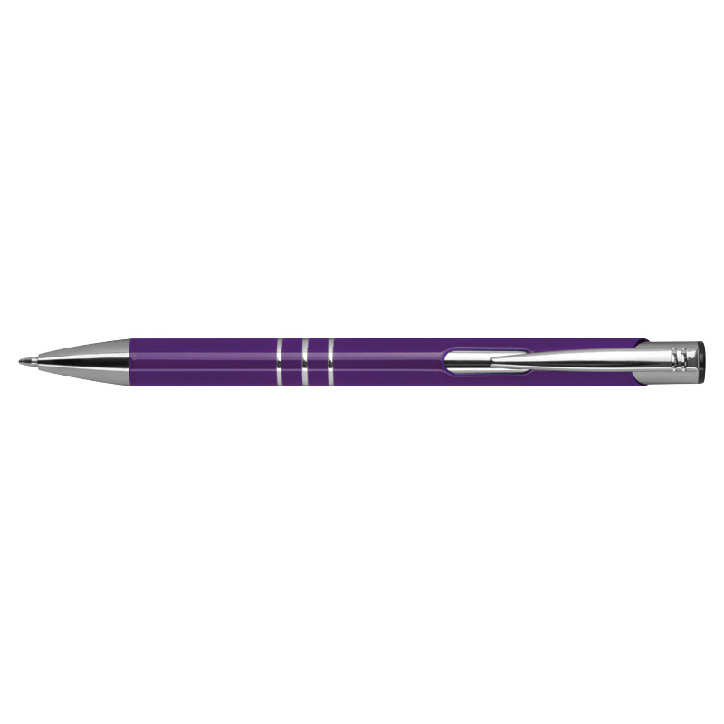 Plne lakované kovové guľôčkové pero s 3 ozdobnými prúžkami. Pero má veľkú modrú náplň.