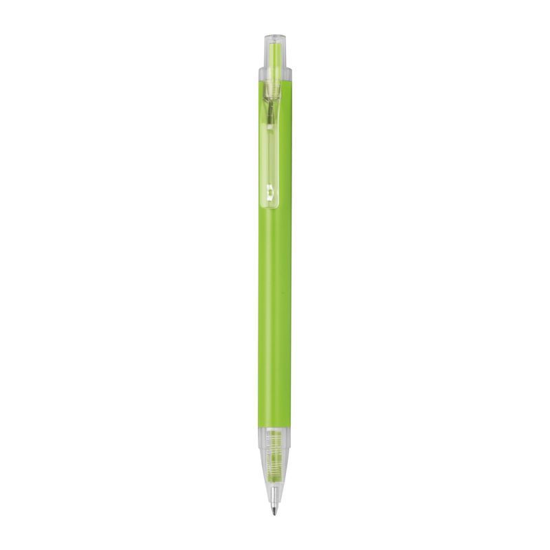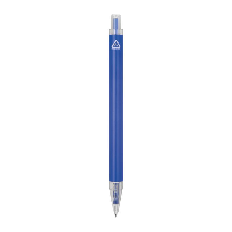 Guľôčkové pero vyrobené z recyklovaného hliníka a plastu (RPET) s priehľadným klipom a modrou atramentovou náplňou.
